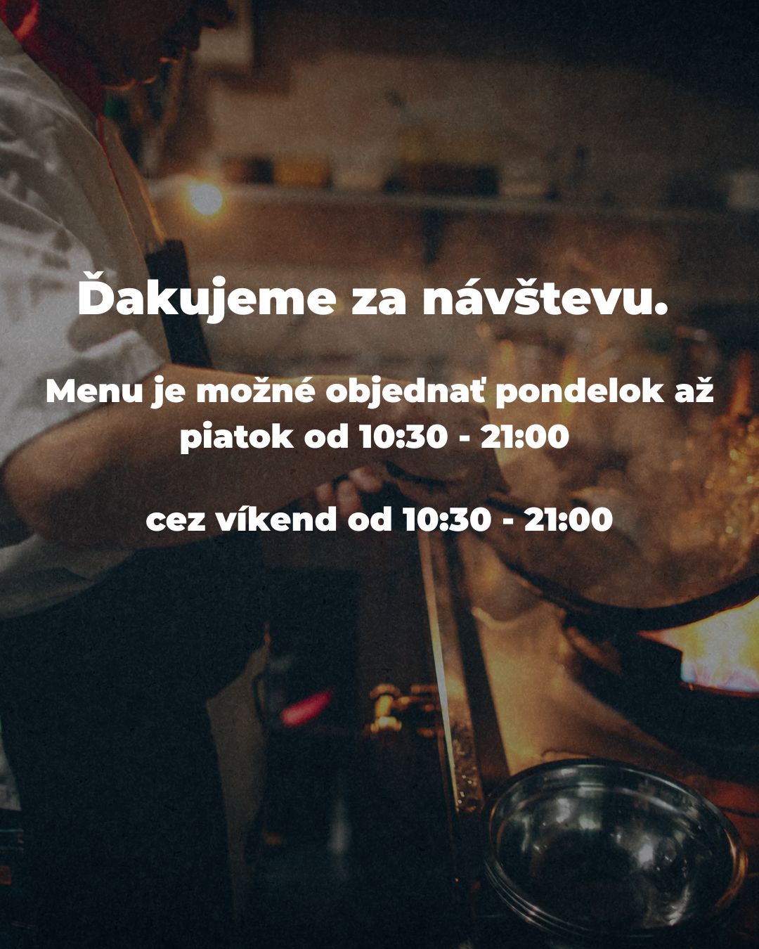 Ďakujeme za návštevu, menu je možné objednať pondelok až piatok od 10:30 - 18:00 ,sobota od 10:30 - 21:00,nedeľa 10:30-17:00